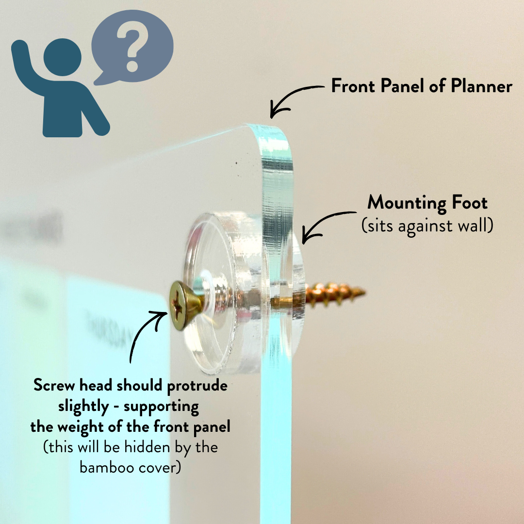 5. Use screws to secure your Planner to the wall, ensuring the head of the screw is also supporting the front panel. (ie, the head of the screw should be sitting just in front of the front panel of your planner).